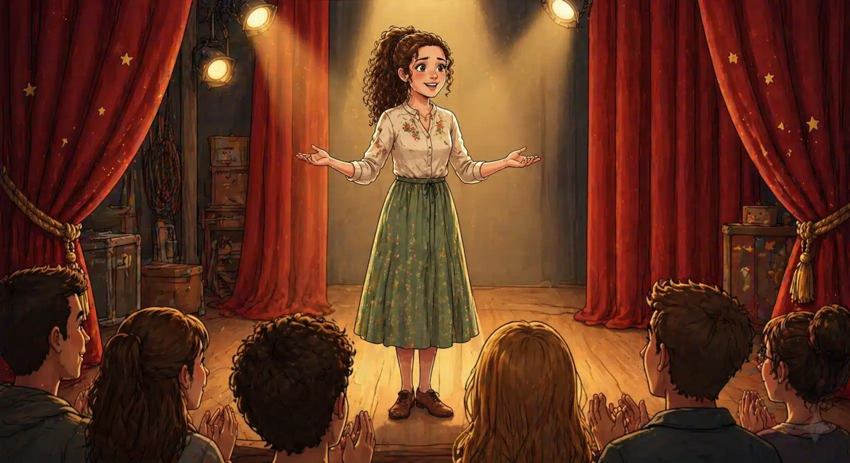 A függöny szétnyílik. Julcsi kilép a fénybe, nem zihálva, nem tördelve a kezét, hanem – mosolyogva. Szabadon. A megértés pajzsa megvédte a lámpaláztól. Nem a közönséget kell bohócnak nézni, hanem a fejedben lévő tudást kell rendbe tenni. A versek már nem titkos kódok, hanem a saját gondolatai. És az ember a saját gondolataitól miért félne?